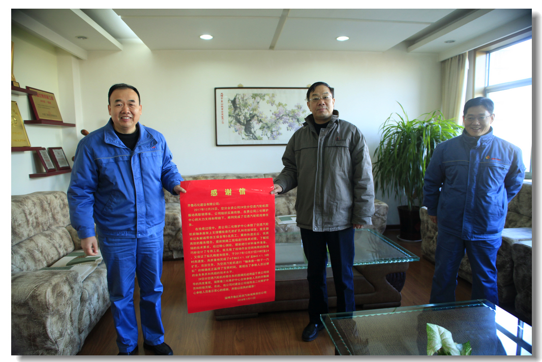 1月11日上午,淄博齊魯比歐西氣體有限責(zé)任公司領(lǐng)導(dǎo)專(zhuān)程送來(lái)感謝信,對(duì)我公司參加其裝置搶修表示感謝,對(duì)施工技術(shù)人員精湛的技術(shù)水平和一流的服務(wù)給予了高度評(píng)價(jià)。